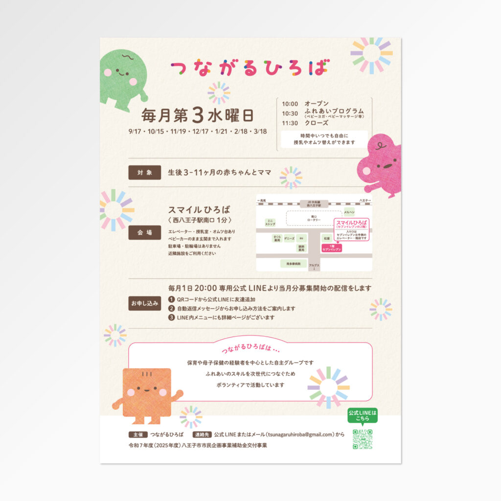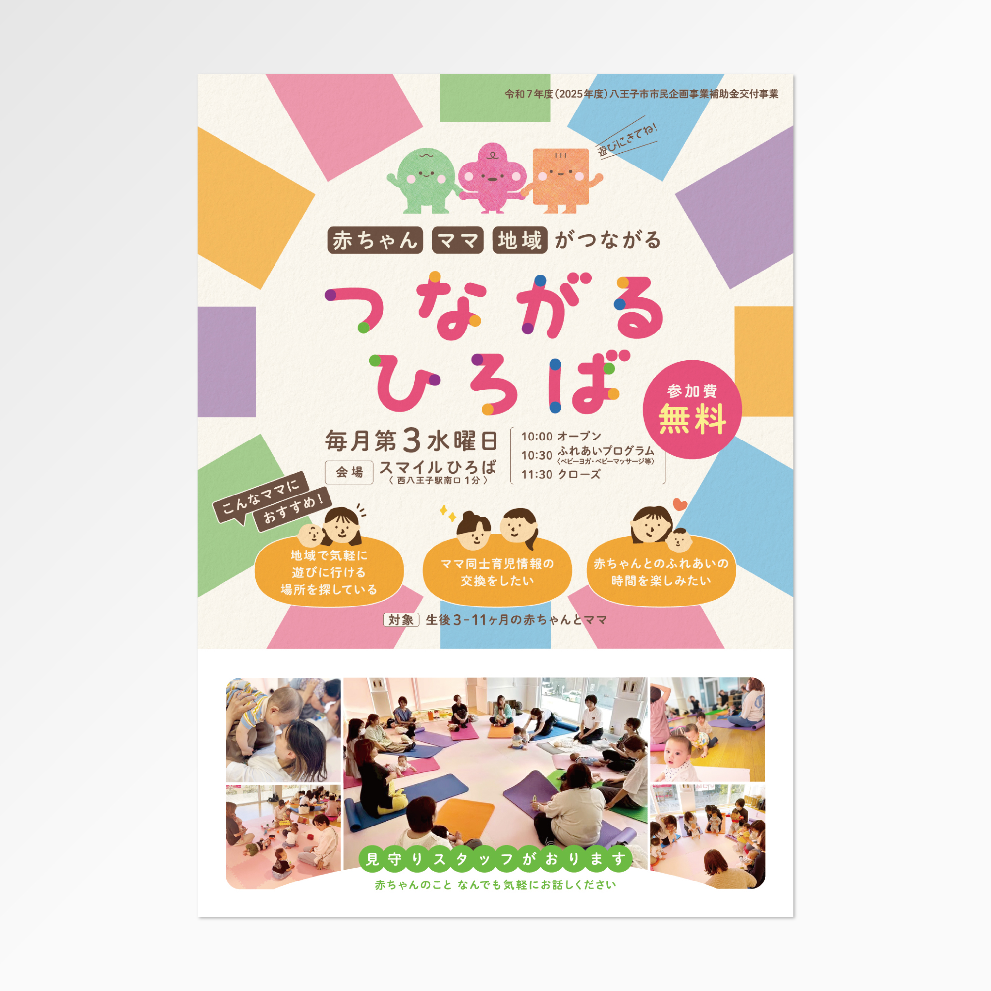 つながるひろば様が主催する、赤ちゃん・ママ・地域 がつながる「つながるひろば」のチラシを制作しました。