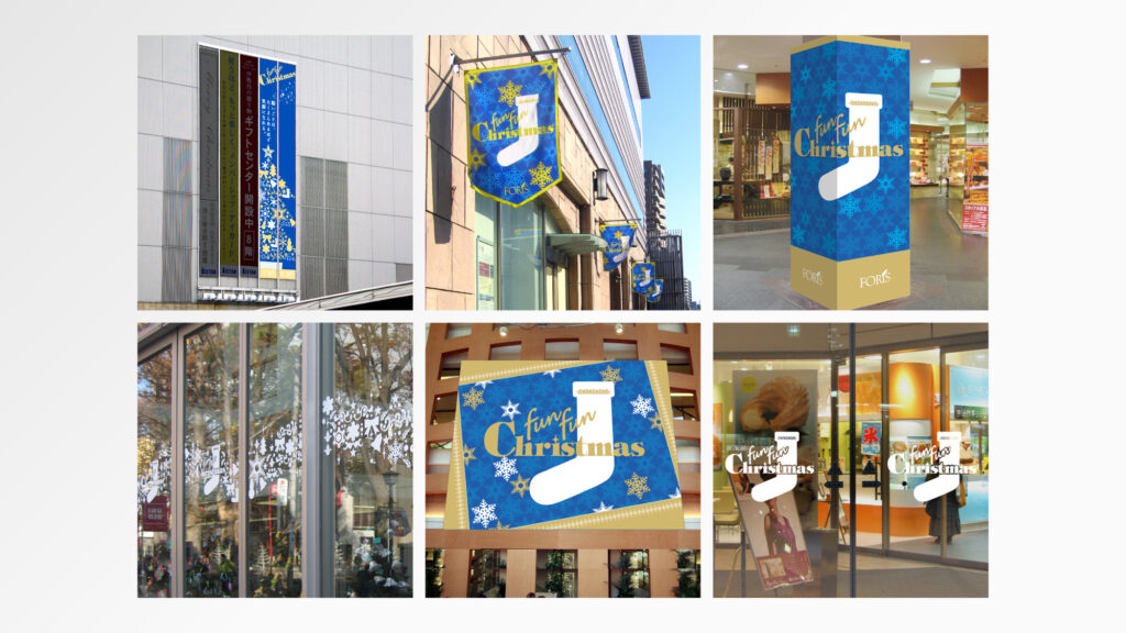 館内・外の各所に「fun fun Christmas」のタイトルロゴを展開し、季節感と華やぎを演出する装飾を実施しました。
