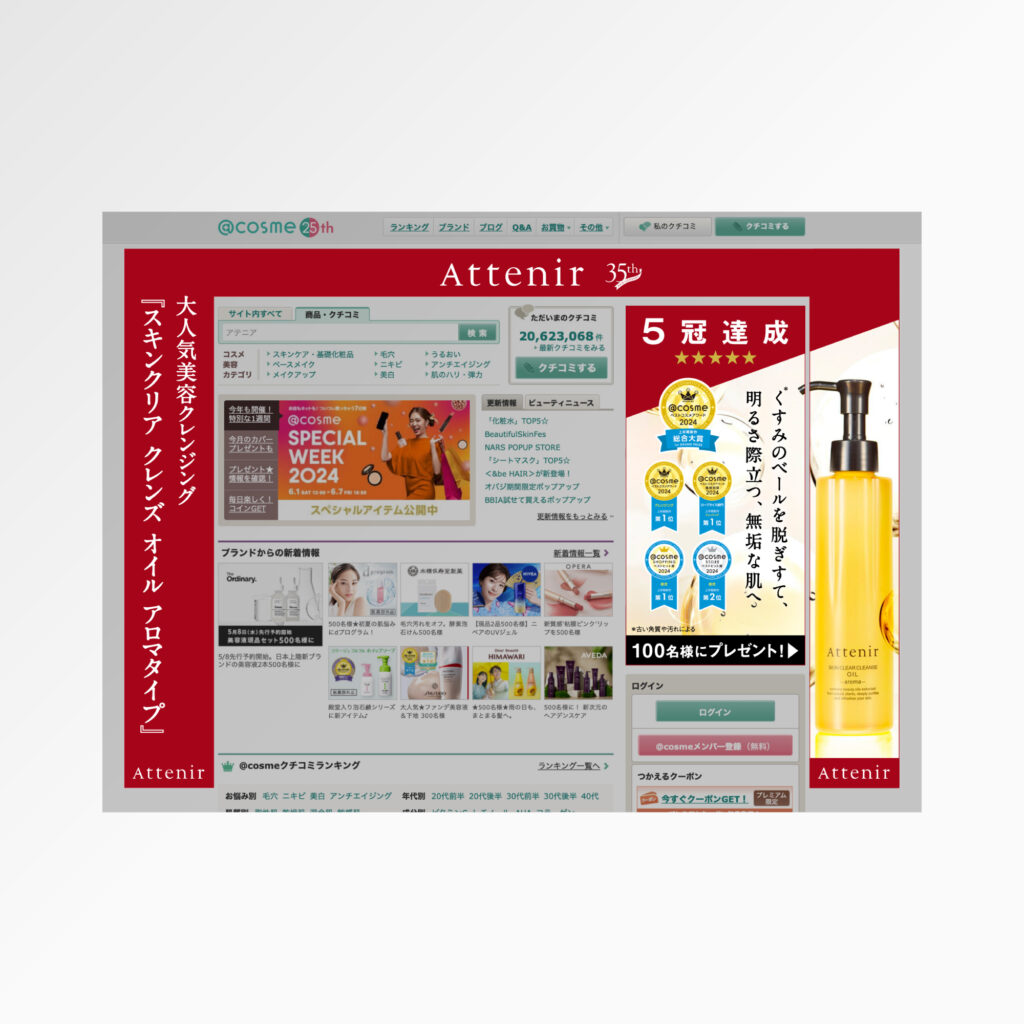 アテニア【 ディスプレイ広告 】 アテニア様の、ディスプレイ広告を制作しました。@cosme トップジャックでは、掲載面全体を活かし、ブランドの世界観と商品の魅力を効果的に表現しています。さらに、@cosmeならではの媒体特性を踏まえ、ユーザーにより響... -