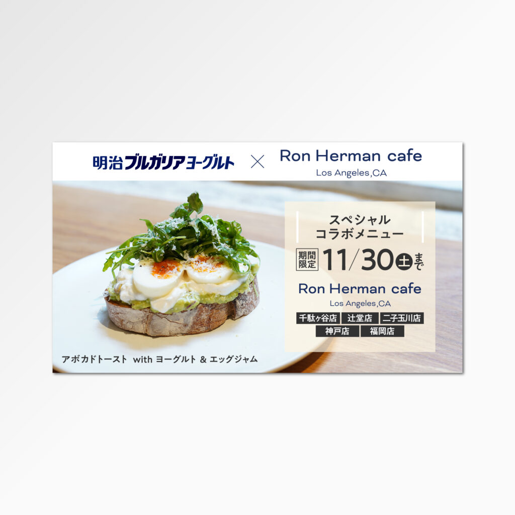 明治×ロンハーマンカフェ【 バナー 】 明治様とロンハーマンカフェ様のコラボレーション施策を告知するバナーを制作しました。「明治ブルガリアヨーグルト」と「ロンハーマンカフェ」という意外なコラボレーションを全面に打ち出し、端的に伝えるデザイン... -