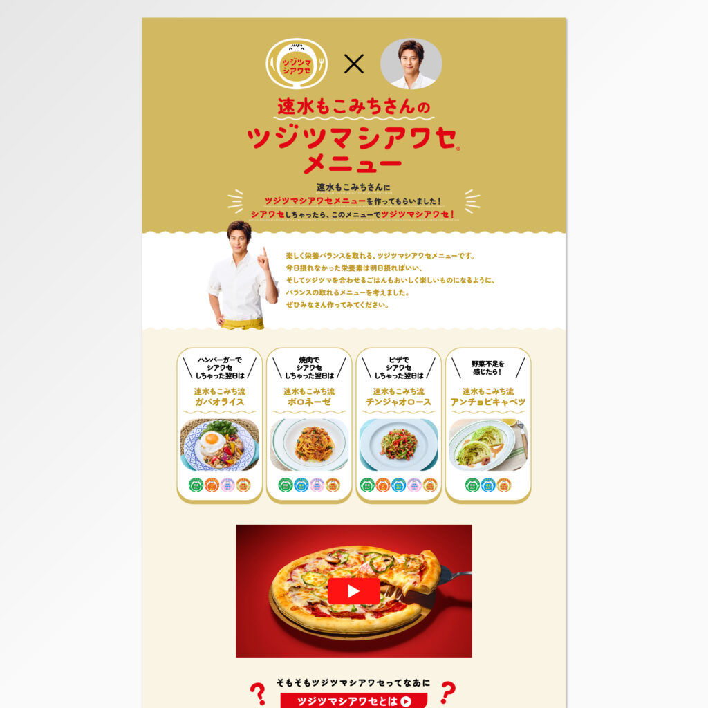 味の素ツジツマシアワセ®︎【 特設サイト 】 【 特設サイト誘導バナー 】 味の素様の「ツジツマシアワセ®」プロジェクト「速水もこみちさんのツジツマシアワセ®メニュー」特設サイト、及びバナーを制作しました。「ツジツマシアワセ®」とは、1食で栄養バラ...