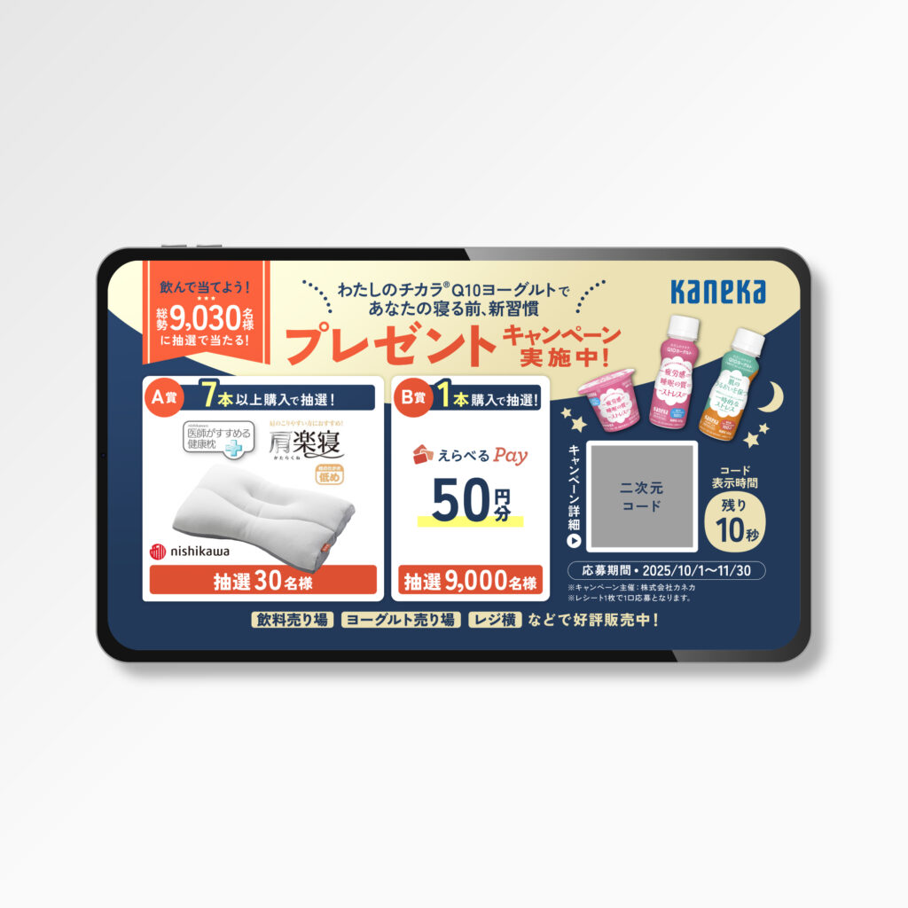 カネカわたしのチカラ®︎Q10ヨーグルト・プレゼントキャンペーン【 ストアビジョン 】 カネカ食品株式会社様の「わたしのチカラ®︎Q10ヨーグルト」購入キャンペーンにおける、店頭デジタルサイネージ広告を制作しました。スーパーマーケットなどの店頭や売り... -